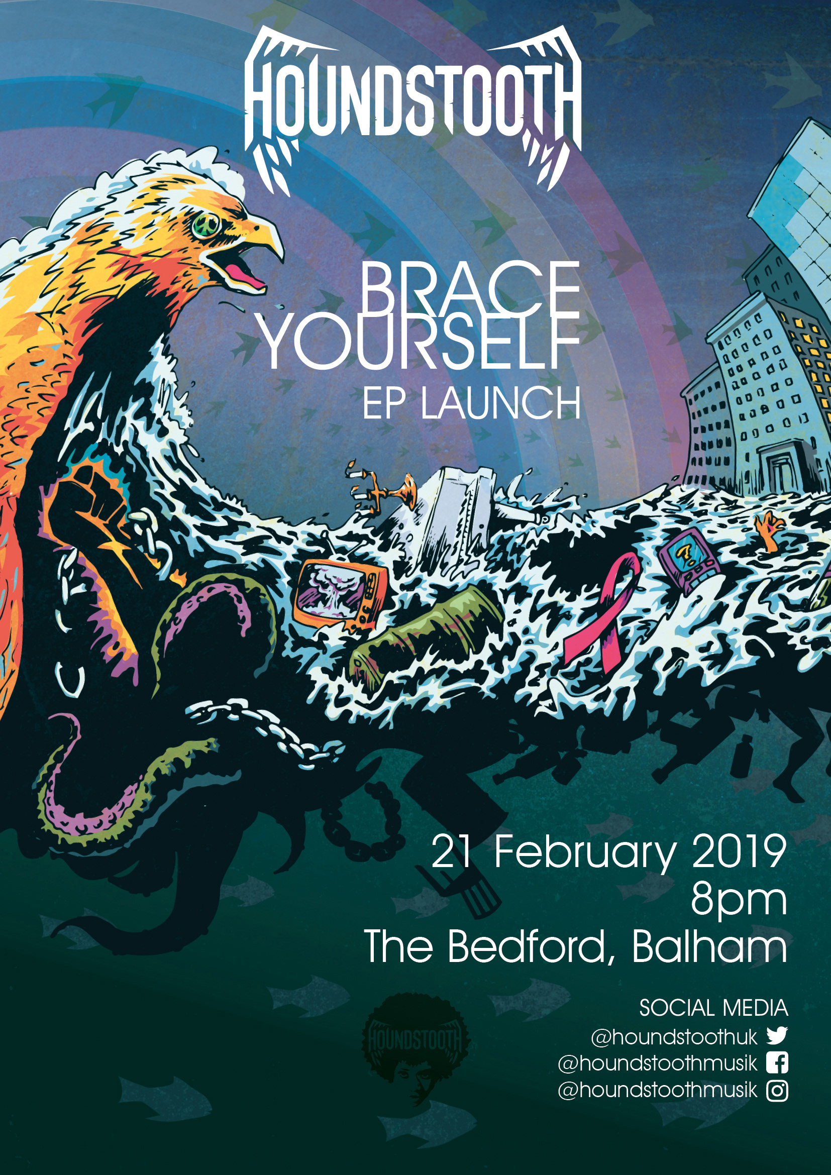 Artwork for London rock/soul band Houndstooth's release 'Brace Yourself', intended to be used in a variety of media, either in full or selected details. I combined imagery suggested by the band, from the record's lyrics etc, into a single image. Stylistically, I was inspired in part by some of the street art I'd seen in the Lower East Side of Manhattan a on a trip there a couple of years previously.