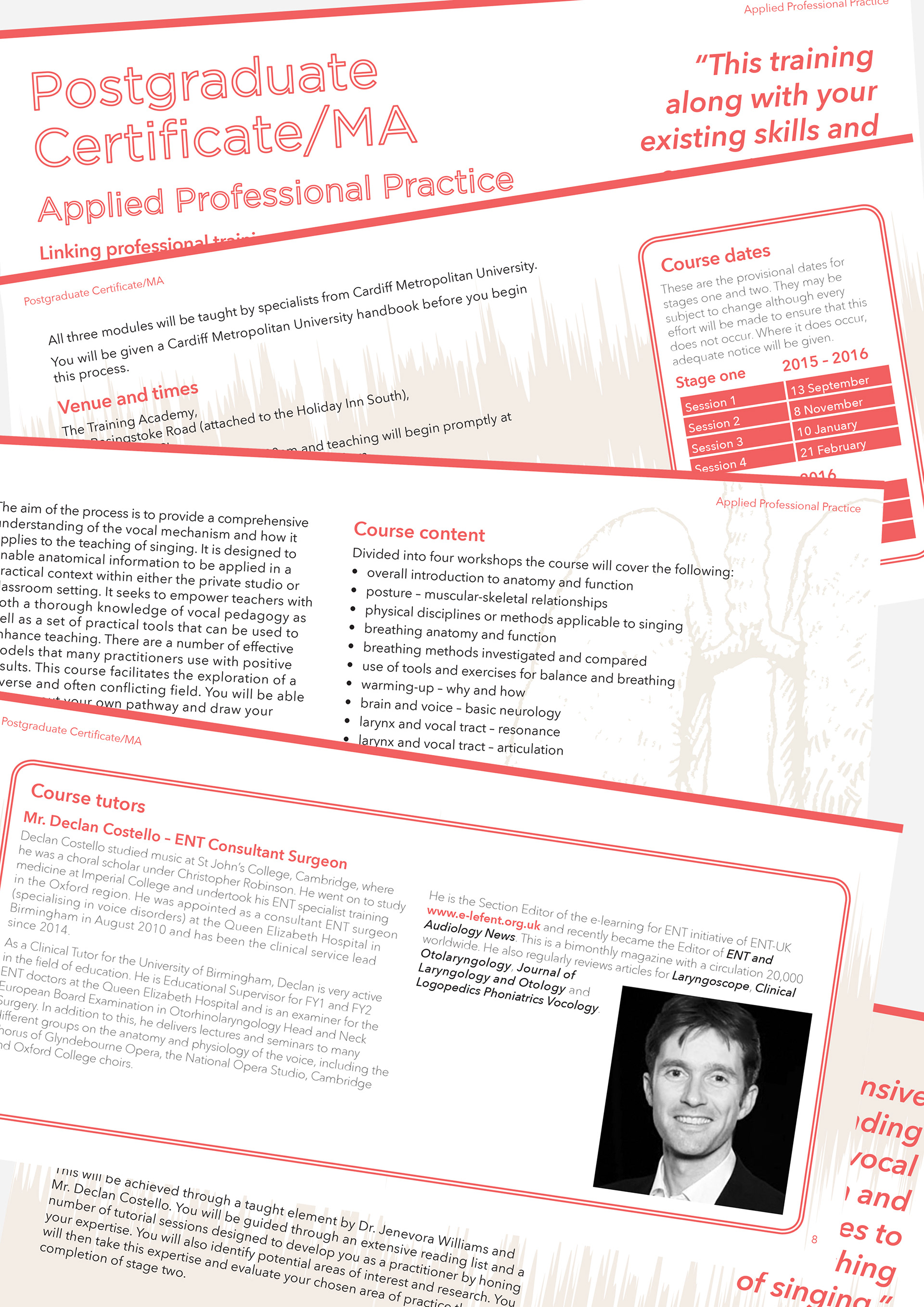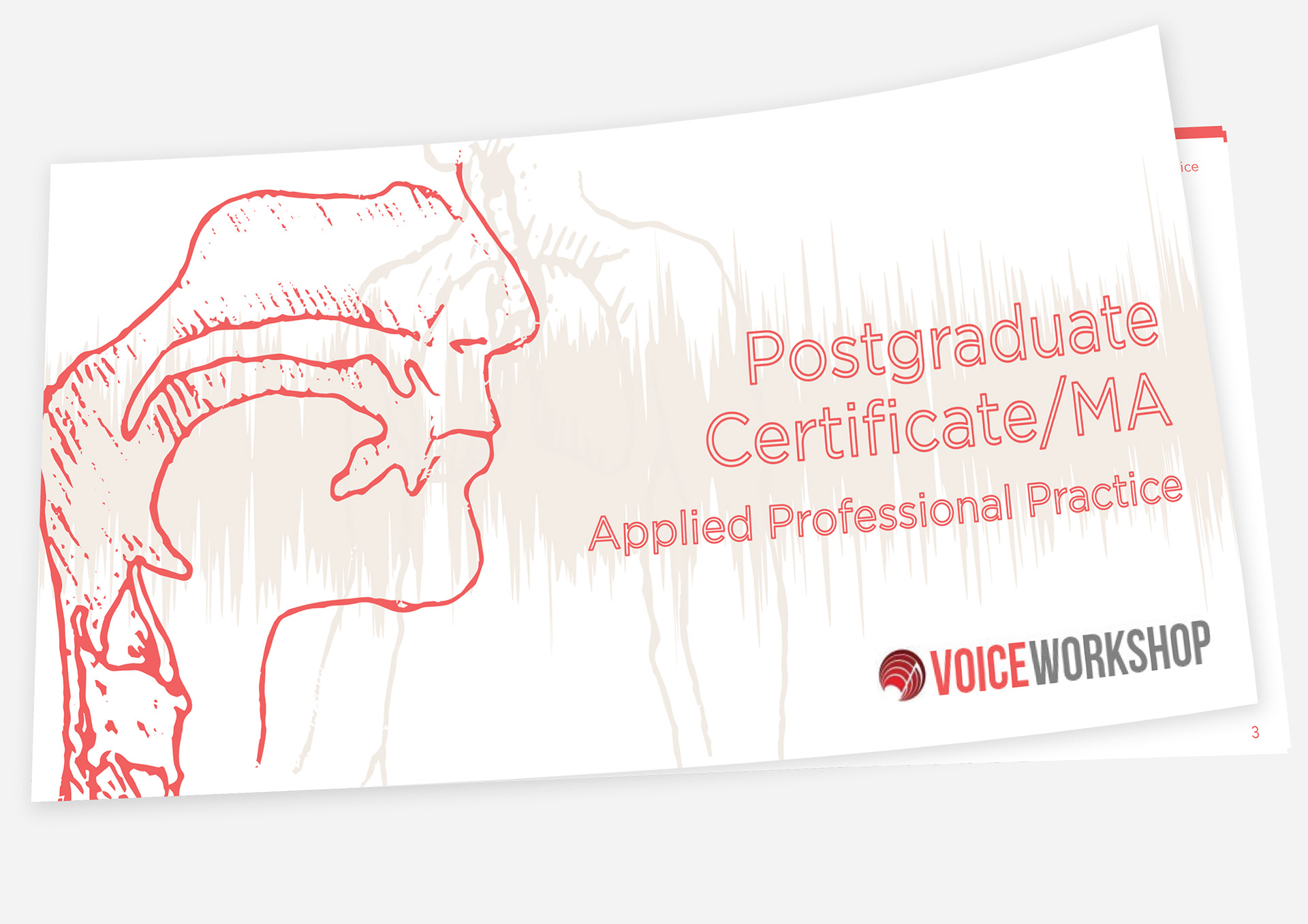 A course brochure/prospectus for Voice Workshop's post-graduate courses in conjunction with Cardiff Metropolitan University. Intended primarily as online PDF document that would also work printed.